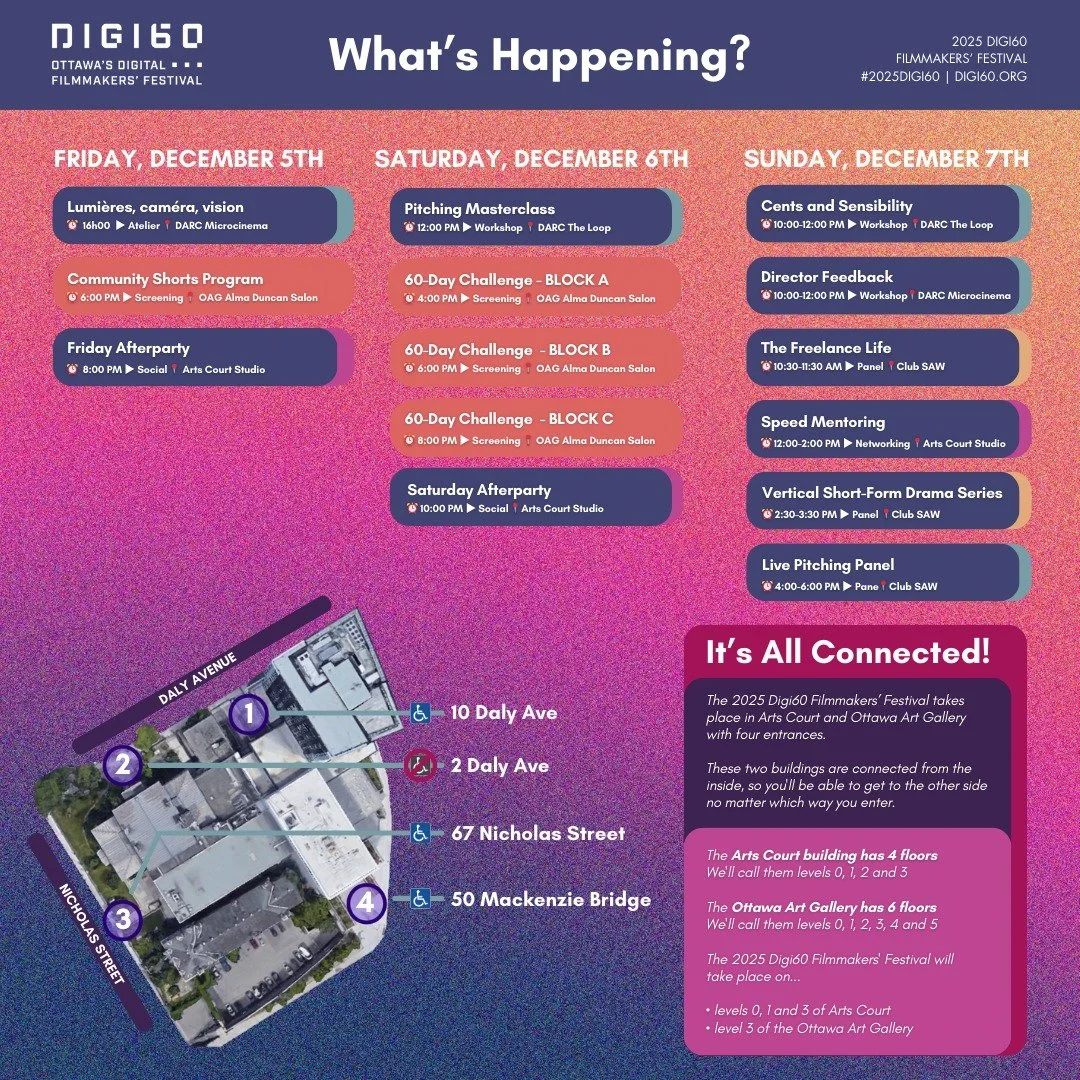 The Digi60 Filmmakers’ Festival is a volunteer-run, registered not-for-profit that operates with the support of funders, sponsors, ticket sales, and generous donations. All donations go directly toward supporting the festival’s operations and programming.